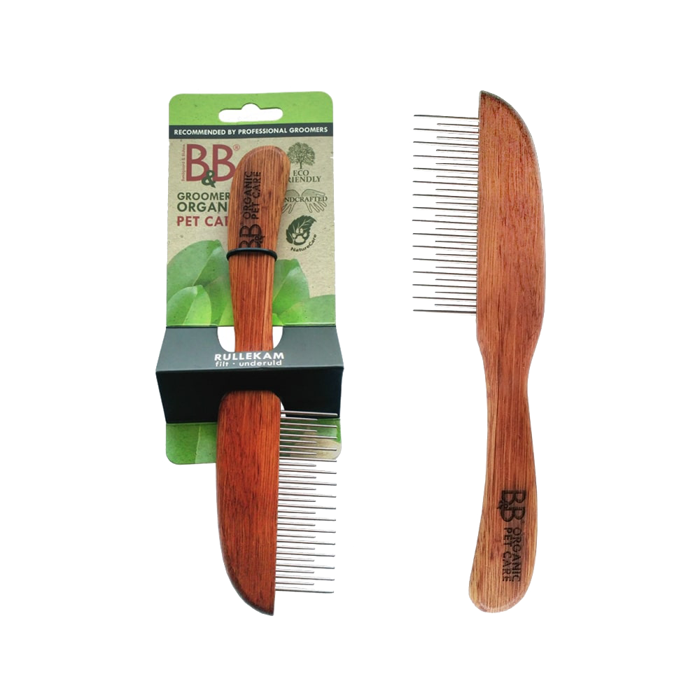 En smidig kam som enkelt glider genom pälsen och löser upp tovor och underull på ett varsamt men effektivt sätt. De rullande tänderna med rundade ändar minskar risken för slitage och gör kamningen behaglig för hunden. Handtaget är ergonomiskt utformat för bästa komfort och tillverkat av hållbart Tamanu-trä.