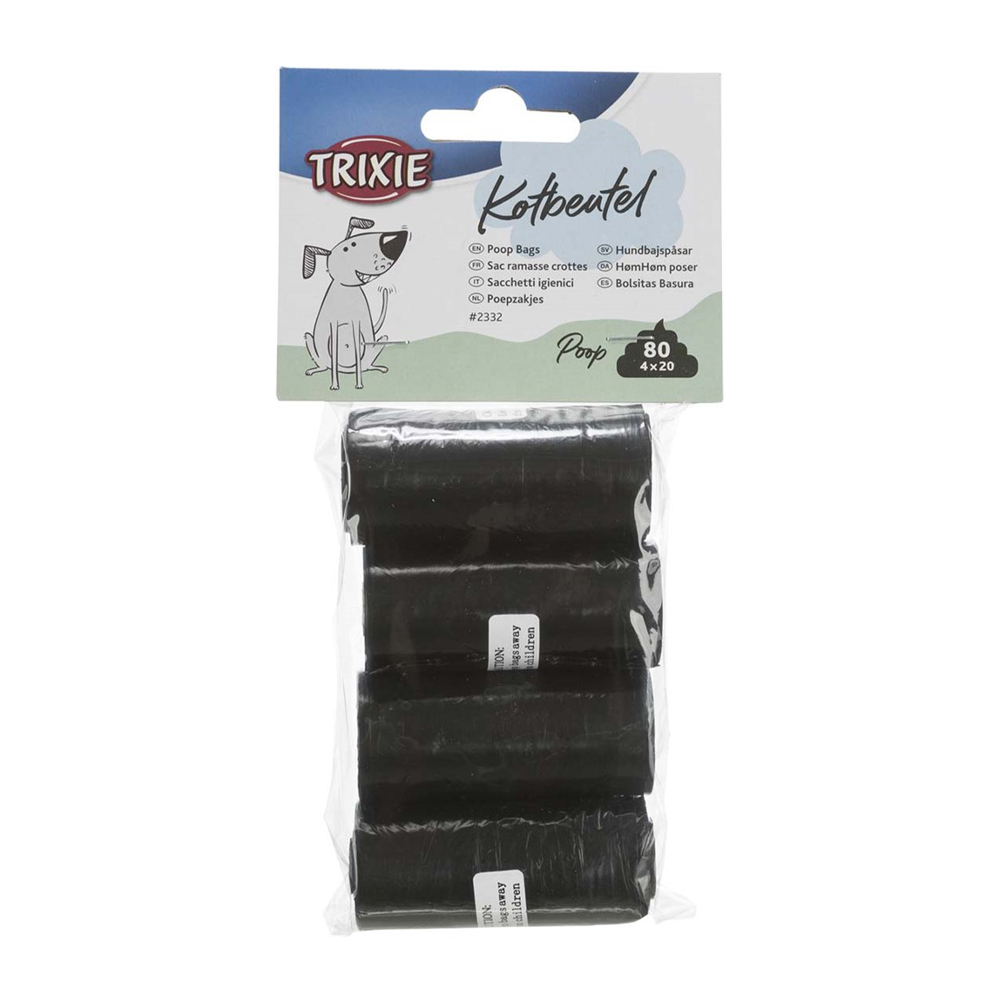 Fire ruller med svarte bæsjeposer som er praktiske og slitesterke for daglig bruk. Perfekt som refill til bæsjeposeholdere og enkle å ta med seg på tur.