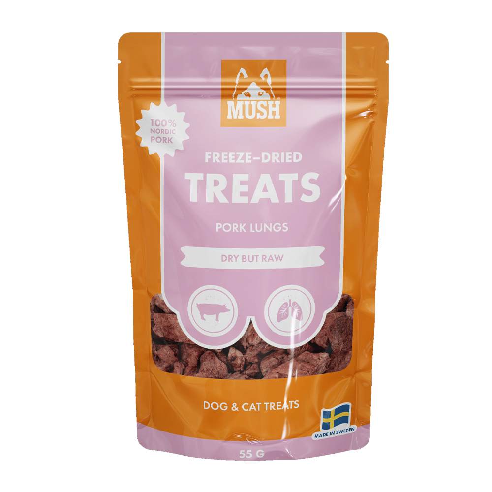 MUSH Treats frysetørket svinelunge er en naturlig og lett hundegodbit med høy næringstetthet som passer for hunder i alle størrelser. Frysetørkingsprosessen bevarer smak og næringsstoffer, mens den luftige teksturen gjør bitene lette å fordøye og tygge.