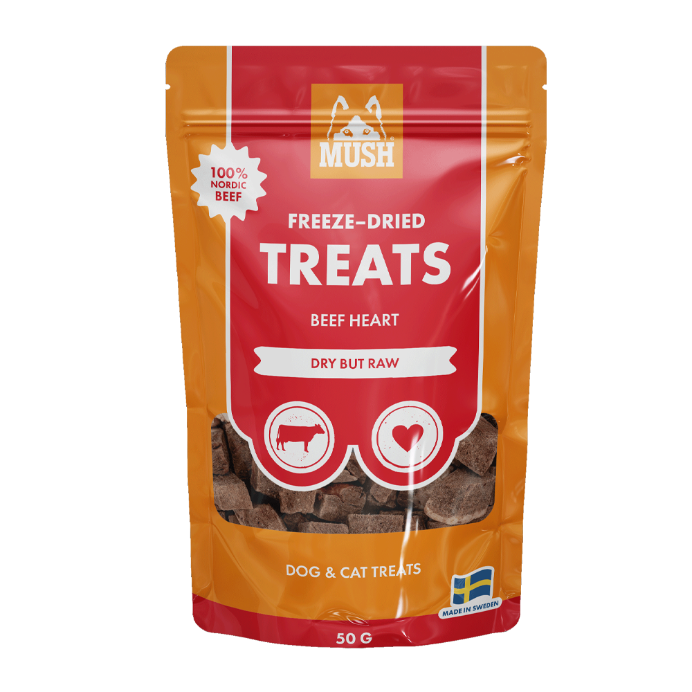 MUSH Treats Frysetørket oksehjerte er en naturlig og proteinrik hundegodbit med en sterk smak som gjør den ekstra fristende som belønning. Oksehjerte er en naturlig kilde til jern og næring, mens den skånsomme frysetørkingen bevarer råvarens kvalitet og smak.