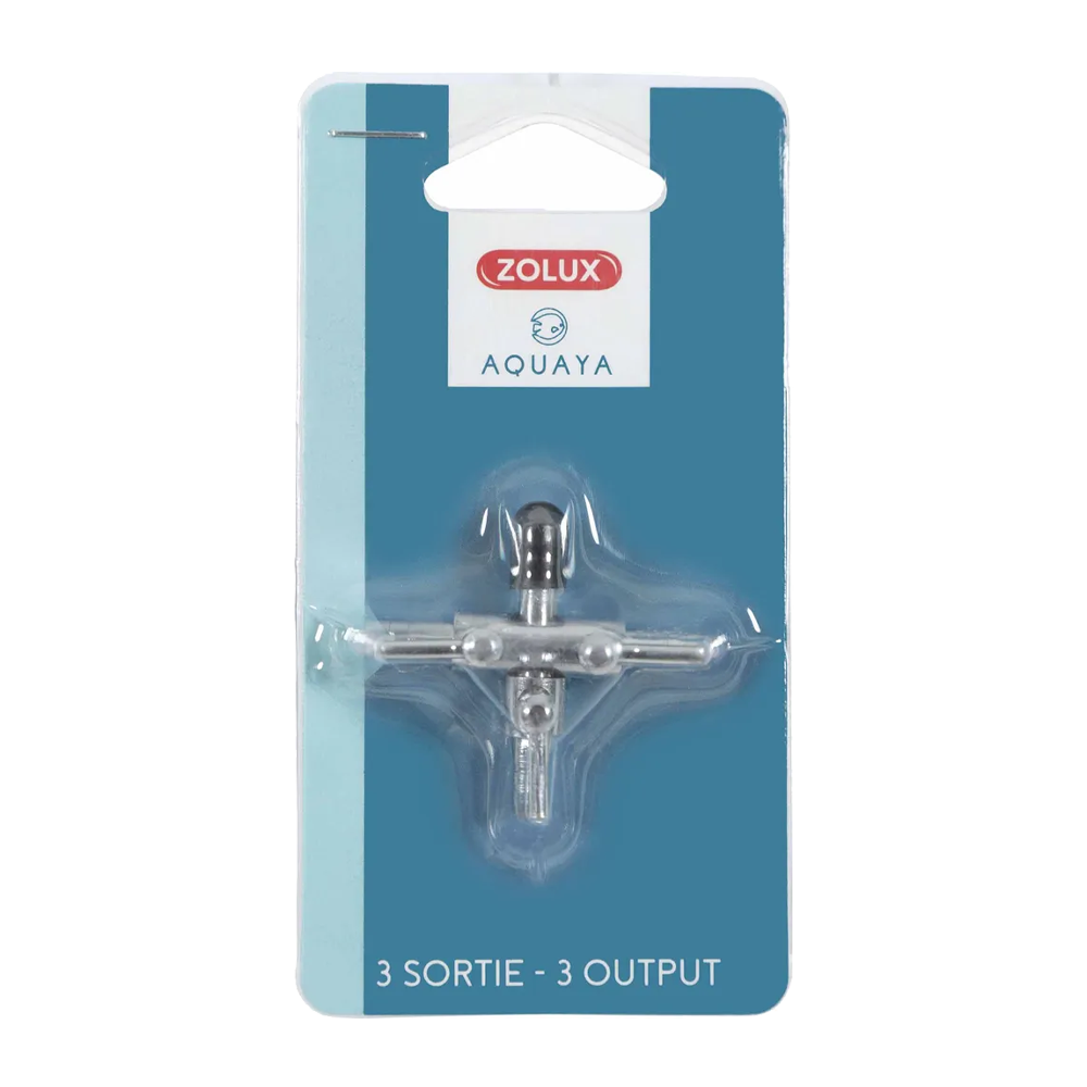 Zolux Kran i metall med tre utgångar gör det enkelt att fördela och justera luftflödet från en luftpump till flera luftstenar, dekorationer eller filter samtidigt. Den stabila metallkonstruktionen garanterar lång hållbarhet och pålitlig funktion.